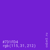 Цвет #731FD4 в цветовой модели RGB обозначается тремя октетами (115, 31, 212) в десятичном формате и #731FD4 в шестнадцатиричном (hex) формате, которые являются интенсивностью красного 115 (hex 73), интенсивность зелёного 31 (hex 1F) и интенсивность синего 212 (hex D4).
