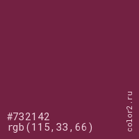 Цвет #732142 в цветовой модели RGB обозначается тремя октетами (115, 33, 66) в десятичном формате и #732142 в шестнадцатиричном (hex) формате, которые являются интенсивностью красного 115 (hex 73), интенсивность зелёного 33 (hex 21) и интенсивность синего 66 (hex 42).