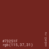 Цвет #73251F в цветовой модели RGB обозначается тремя октетами (115, 37, 31) в десятичном формате и #73251F в шестнадцатиричном (hex) формате, которые являются интенсивностью красного 115 (hex 73), интенсивность зелёного 37 (hex 25) и интенсивность синего 31 (hex 1F).
