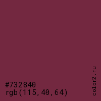 Цвет #732840 в цветовой модели RGB обозначается тремя октетами (115, 40, 64) в десятичном формате и #732840 в шестнадцатиричном (hex) формате, которые являются интенсивностью красного 115 (hex 73), интенсивность зелёного 40 (hex 28) и интенсивность синего 64 (hex 40).