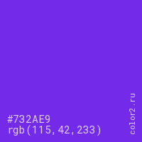 Цвет #732AE9 в цветовой модели RGB обозначается тремя октетами (115, 42, 233) в десятичном формате и #732AE9 в шестнадцатиричном (hex) формате, которые являются интенсивностью красного 115 (hex 73), интенсивность зелёного 42 (hex 2A) и интенсивность синего 233 (hex E9).