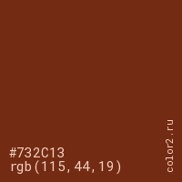 Цвет #732C13 в цветовой модели RGB обозначается тремя октетами (115, 44, 19) в десятичном формате и #732C13 в шестнадцатиричном (hex) формате, которые являются интенсивностью красного 115 (hex 73), интенсивность зелёного 44 (hex 2C) и интенсивность синего 19 (hex 13).