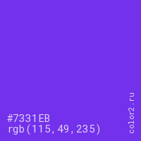 Цвет #7331EB в цветовой модели RGB обозначается тремя октетами (115, 49, 235) в десятичном формате и #7331EB в шестнадцатиричном (hex) формате, которые являются интенсивностью красного 115 (hex 73), интенсивность зелёного 49 (hex 31) и интенсивность синего 235 (hex EB).