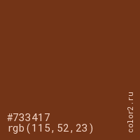 Цвет #733417 в цветовой модели RGB обозначается тремя октетами (115, 52, 23) в десятичном формате и #733417 в шестнадцатиричном (hex) формате, которые являются интенсивностью красного 115 (hex 73), интенсивность зелёного 52 (hex 34) и интенсивность синего 23 (hex 17).