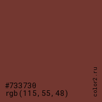 Цвет #733730 в цветовой модели RGB обозначается тремя октетами (115, 55, 48) в десятичном формате и #733730 в шестнадцатиричном (hex) формате, которые являются интенсивностью красного 115 (hex 73), интенсивность зелёного 55 (hex 37) и интенсивность синего 48 (hex 30).