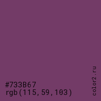 Цвет #733B67 в цветовой модели RGB обозначается тремя октетами (115, 59, 103) в десятичном формате и #733B67 в шестнадцатиричном (hex) формате, которые являются интенсивностью красного 115 (hex 73), интенсивность зелёного 59 (hex 3B) и интенсивность синего 103 (hex 67).