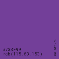 Цвет #733F99 в цветовой модели RGB обозначается тремя октетами (115, 63, 153) в десятичном формате и #733F99 в шестнадцатиричном (hex) формате, которые являются интенсивностью красного 115 (hex 73), интенсивность зелёного 63 (hex 3F) и интенсивность синего 153 (hex 99).