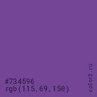Цвет #734596 в цветовой модели RGB обозначается тремя октетами (115, 69, 150) в десятичном формате и #734596 в шестнадцатиричном (hex) формате, которые являются интенсивностью красного 115 (hex 73), интенсивность зелёного 69 (hex 45) и интенсивность синего 150 (hex 96).
