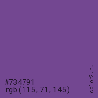 Цвет #734791 в цветовой модели RGB обозначается тремя октетами (115, 71, 145) в десятичном формате и #734791 в шестнадцатиричном (hex) формате, которые являются интенсивностью красного 115 (hex 73), интенсивность зелёного 71 (hex 47) и интенсивность синего 145 (hex 91).