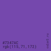 Цвет #7347AC в цветовой модели RGB обозначается тремя октетами (115, 71, 172) в десятичном формате и #7347AC в шестнадцатиричном (hex) формате, которые являются интенсивностью красного 115 (hex 73), интенсивность зелёного 71 (hex 47) и интенсивность синего 172 (hex AC).