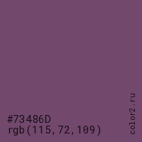 Цвет #73486D в цветовой модели RGB обозначается тремя октетами (115, 72, 109) в десятичном формате и #73486D в шестнадцатиричном (hex) формате, которые являются интенсивностью красного 115 (hex 73), интенсивность зелёного 72 (hex 48) и интенсивность синего 109 (hex 6D).