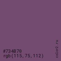 Цвет #734B70 в цветовой модели RGB обозначается тремя октетами (115, 75, 112) в десятичном формате и #734B70 в шестнадцатиричном (hex) формате, которые являются интенсивностью красного 115 (hex 73), интенсивность зелёного 75 (hex 4B) и интенсивность синего 112 (hex 70).