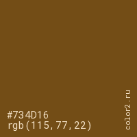 Цвет #734D16 в цветовой модели RGB обозначается тремя октетами (115, 77, 22) в десятичном формате и #734D16 в шестнадцатиричном (hex) формате, которые являются интенсивностью красного 115 (hex 73), интенсивность зелёного 77 (hex 4D) и интенсивность синего 22 (hex 16).