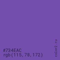 Цвет #734EAC в цветовой модели RGB обозначается тремя октетами (115, 78, 172) в десятичном формате и #734EAC в шестнадцатиричном (hex) формате, которые являются интенсивностью красного 115 (hex 73), интенсивность зелёного 78 (hex 4E) и интенсивность синего 172 (hex AC).