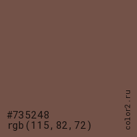 Цвет #735248 в цветовой модели RGB обозначается тремя октетами (115, 82, 72) в десятичном формате и #735248 в шестнадцатиричном (hex) формате, которые являются интенсивностью красного 115 (hex 73), интенсивность зелёного 82 (hex 52) и интенсивность синего 72 (hex 48).