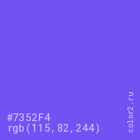 Цвет #7352F4 в цветовой модели RGB обозначается тремя октетами (115, 82, 244) в десятичном формате и #7352F4 в шестнадцатиричном (hex) формате, которые являются интенсивностью красного 115 (hex 73), интенсивность зелёного 82 (hex 52) и интенсивность синего 244 (hex F4).
