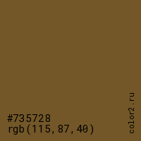 Цвет #735728 в цветовой модели RGB обозначается тремя октетами (115, 87, 40) в десятичном формате и #735728 в шестнадцатиричном (hex) формате, которые являются интенсивностью красного 115 (hex 73), интенсивность зелёного 87 (hex 57) и интенсивность синего 40 (hex 28).
