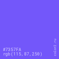 Цвет #7357FA в цветовой модели RGB обозначается тремя октетами (115, 87, 250) в десятичном формате и #7357FA в шестнадцатиричном (hex) формате, которые являются интенсивностью красного 115 (hex 73), интенсивность зелёного 87 (hex 57) и интенсивность синего 250 (hex FA).