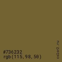 Цвет #736232 в цветовой модели RGB обозначается тремя октетами (115, 98, 50) в десятичном формате и #736232 в шестнадцатиричном (hex) формате, которые являются интенсивностью красного 115 (hex 73), интенсивность зелёного 98 (hex 62) и интенсивность синего 50 (hex 32).