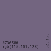 Цвет #736580 в цветовой модели RGB обозначается тремя октетами (115, 101, 128) в десятичном формате и #736580 в шестнадцатиричном (hex) формате, которые являются интенсивностью красного 115 (hex 73), интенсивность зелёного 101 (hex 65) и интенсивность синего 128 (hex 80).