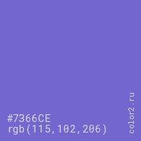 Цвет #7366CE в цветовой модели RGB обозначается тремя октетами (115, 102, 206) в десятичном формате и #7366CE в шестнадцатиричном (hex) формате, которые являются интенсивностью красного 115 (hex 73), интенсивность зелёного 102 (hex 66) и интенсивность синего 206 (hex CE).