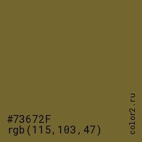 Цвет #73672F в цветовой модели RGB обозначается тремя октетами (115, 103, 47) в десятичном формате и #73672F в шестнадцатиричном (hex) формате, которые являются интенсивностью красного 115 (hex 73), интенсивность зелёного 103 (hex 67) и интенсивность синего 47 (hex 2F).