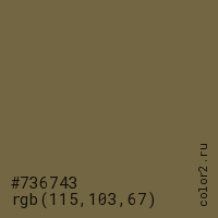 Цвет #736743 в цветовой модели RGB обозначается тремя октетами (115, 103, 67) в десятичном формате и #736743 в шестнадцатиричном (hex) формате, которые являются интенсивностью красного 115 (hex 73), интенсивность зелёного 103 (hex 67) и интенсивность синего 67 (hex 43).