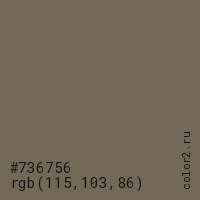 Цвет #736756 в цветовой модели RGB обозначается тремя октетами (115, 103, 86) в десятичном формате и #736756 в шестнадцатиричном (hex) формате, которые являются интенсивностью красного 115 (hex 73), интенсивность зелёного 103 (hex 67) и интенсивность синего 86 (hex 56).
