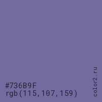 Цвет #736B9F в цветовой модели RGB обозначается тремя октетами (115, 107, 159) в десятичном формате и #736B9F в шестнадцатиричном (hex) формате, которые являются интенсивностью красного 115 (hex 73), интенсивность зелёного 107 (hex 6B) и интенсивность синего 159 (hex 9F).