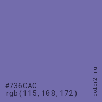 Цвет #736CAC в цветовой модели RGB обозначается тремя октетами (115, 108, 172) в десятичном формате и #736CAC в шестнадцатиричном (hex) формате, которые являются интенсивностью красного 115 (hex 73), интенсивность зелёного 108 (hex 6C) и интенсивность синего 172 (hex AC).