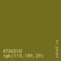 Цвет #736D1D в цветовой модели RGB обозначается тремя октетами (115, 109, 29) в десятичном формате и #736D1D в шестнадцатиричном (hex) формате, которые являются интенсивностью красного 115 (hex 73), интенсивность зелёного 109 (hex 6D) и интенсивность синего 29 (hex 1D).