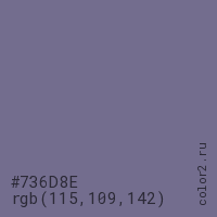 Цвет #736D8E в цветовой модели RGB обозначается тремя октетами (115, 109, 142) в десятичном формате и #736D8E в шестнадцатиричном (hex) формате, которые являются интенсивностью красного 115 (hex 73), интенсивность зелёного 109 (hex 6D) и интенсивность синего 142 (hex 8E).