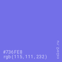 Цвет #736FE8 в цветовой модели RGB обозначается тремя октетами (115, 111, 232) в десятичном формате и #736FE8 в шестнадцатиричном (hex) формате, которые являются интенсивностью красного 115 (hex 73), интенсивность зелёного 111 (hex 6F) и интенсивность синего 232 (hex E8).