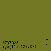 Цвет #737825 в цветовой модели RGB обозначается тремя октетами (115, 120, 37) в десятичном формате и #737825 в шестнадцатиричном (hex) формате, которые являются интенсивностью красного 115 (hex 73), интенсивность зелёного 120 (hex 78) и интенсивность синего 37 (hex 25).