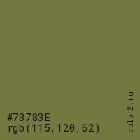 Цвет #73783E в цветовой модели RGB обозначается тремя октетами (115, 120, 62) в десятичном формате и #73783E в шестнадцатиричном (hex) формате, которые являются интенсивностью красного 115 (hex 73), интенсивность зелёного 120 (hex 78) и интенсивность синего 62 (hex 3E).