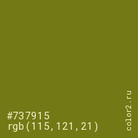 Цвет #737915 в цветовой модели RGB обозначается тремя октетами (115, 121, 21) в десятичном формате и #737915 в шестнадцатиричном (hex) формате, которые являются интенсивностью красного 115 (hex 73), интенсивность зелёного 121 (hex 79) и интенсивность синего 21 (hex 15).