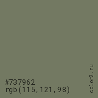 Цвет #737962 в цветовой модели RGB обозначается тремя октетами (115, 121, 98) в десятичном формате и #737962 в шестнадцатиричном (hex) формате, которые являются интенсивностью красного 115 (hex 73), интенсивность зелёного 121 (hex 79) и интенсивность синего 98 (hex 62).