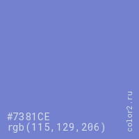 Цвет #7381CE в цветовой модели RGB обозначается тремя октетами (115, 129, 206) в десятичном формате и #7381CE в шестнадцатиричном (hex) формате, которые являются интенсивностью красного 115 (hex 73), интенсивность зелёного 129 (hex 81) и интенсивность синего 206 (hex CE).