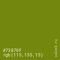 Цвет #73870F в цветовой модели RGB обозначается тремя октетами (115, 135, 15) в десятичном формате и #73870F в шестнадцатиричном (hex) формате, которые являются интенсивностью красного 115 (hex 73), интенсивность зелёного 135 (hex 87) и интенсивность синего 15 (hex 0F).