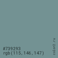Цвет #739293 в цветовой модели RGB обозначается тремя октетами (115, 146, 147) в десятичном формате и #739293 в шестнадцатиричном (hex) формате, которые являются интенсивностью красного 115 (hex 73), интенсивность зелёного 146 (hex 92) и интенсивность синего 147 (hex 93).