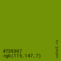 Цвет #739307 в цветовой модели RGB обозначается тремя октетами (115, 147, 7) в десятичном формате и #739307 в шестнадцатиричном (hex) формате, которые являются интенсивностью красного 115 (hex 73), интенсивность зелёного 147 (hex 93) и интенсивность синего 7 (hex 07).