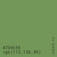 Цвет #739659 в цветовой модели RGB обозначается тремя октетами (115, 150, 89) в десятичном формате и #739659 в шестнадцатиричном (hex) формате, которые являются интенсивностью красного 115 (hex 73), интенсивность зелёного 150 (hex 96) и интенсивность синего 89 (hex 59).