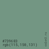 Цвет #739683 в цветовой модели RGB обозначается тремя октетами (115, 150, 131) в десятичном формате и #739683 в шестнадцатиричном (hex) формате, которые являются интенсивностью красного 115 (hex 73), интенсивность зелёного 150 (hex 96) и интенсивность синего 131 (hex 83).