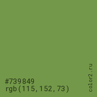 Цвет #739849 в цветовой модели RGB обозначается тремя октетами (115, 152, 73) в десятичном формате и #739849 в шестнадцатиричном (hex) формате, которые являются интенсивностью красного 115 (hex 73), интенсивность зелёного 152 (hex 98) и интенсивность синего 73 (hex 49).