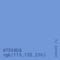 Цвет #7398D8 в цветовой модели RGB обозначается тремя октетами (115, 152, 216) в десятичном формате и #7398D8 в шестнадцатиричном (hex) формате, которые являются интенсивностью красного 115 (hex 73), интенсивность зелёного 152 (hex 98) и интенсивность синего 216 (hex D8).