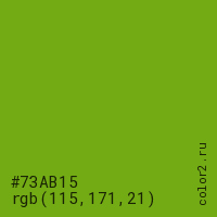 Цвет #73AB15 в цветовой модели RGB обозначается тремя октетами (115, 171, 21) в десятичном формате и #73AB15 в шестнадцатиричном (hex) формате, которые являются интенсивностью красного 115 (hex 73), интенсивность зелёного 171 (hex AB) и интенсивность синего 21 (hex 15).