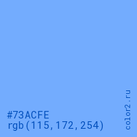 Цвет #73ACFE в цветовой модели RGB обозначается тремя октетами (115, 172, 254) в десятичном формате и #73ACFE в шестнадцатиричном (hex) формате, которые являются интенсивностью красного 115 (hex 73), интенсивность зелёного 172 (hex AC) и интенсивность синего 254 (hex FE).