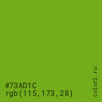 Цвет #73AD1C в цветовой модели RGB обозначается тремя октетами (115, 173, 28) в десятичном формате и #73AD1C в шестнадцатиричном (hex) формате, которые являются интенсивностью красного 115 (hex 73), интенсивность зелёного 173 (hex AD) и интенсивность синего 28 (hex 1C).
