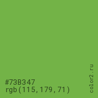 Цвет #73B347 в цветовой модели RGB обозначается тремя октетами (115, 179, 71) в десятичном формате и #73B347 в шестнадцатиричном (hex) формате, которые являются интенсивностью красного 115 (hex 73), интенсивность зелёного 179 (hex B3) и интенсивность синего 71 (hex 47).