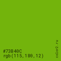 Цвет #73B40C в цветовой модели RGB обозначается тремя октетами (115, 180, 12) в десятичном формате и #73B40C в шестнадцатиричном (hex) формате, которые являются интенсивностью красного 115 (hex 73), интенсивность зелёного 180 (hex B4) и интенсивность синего 12 (hex 0C).